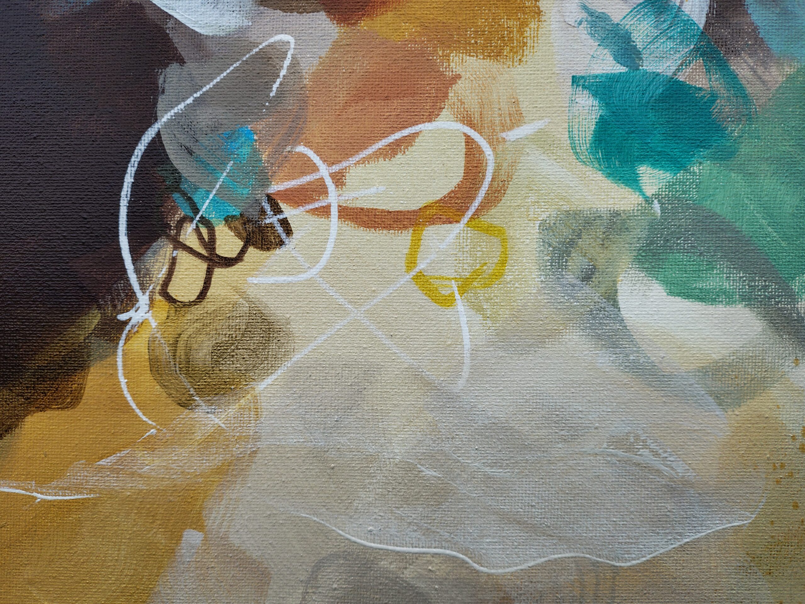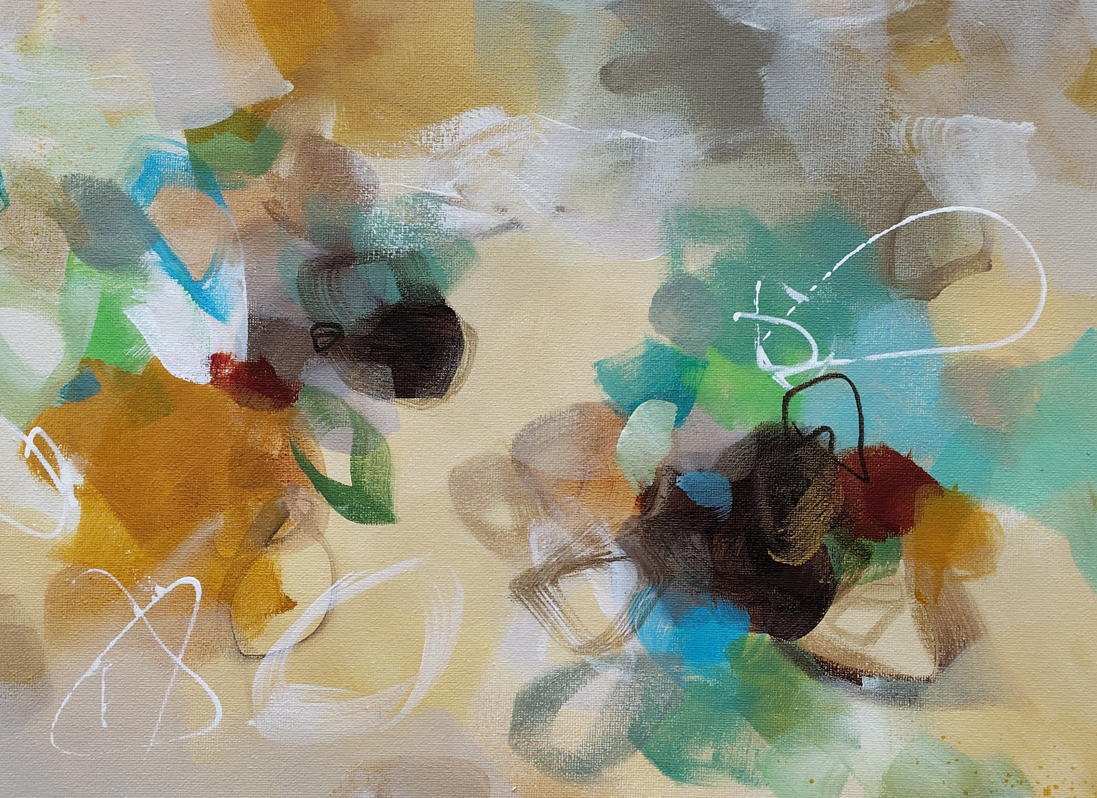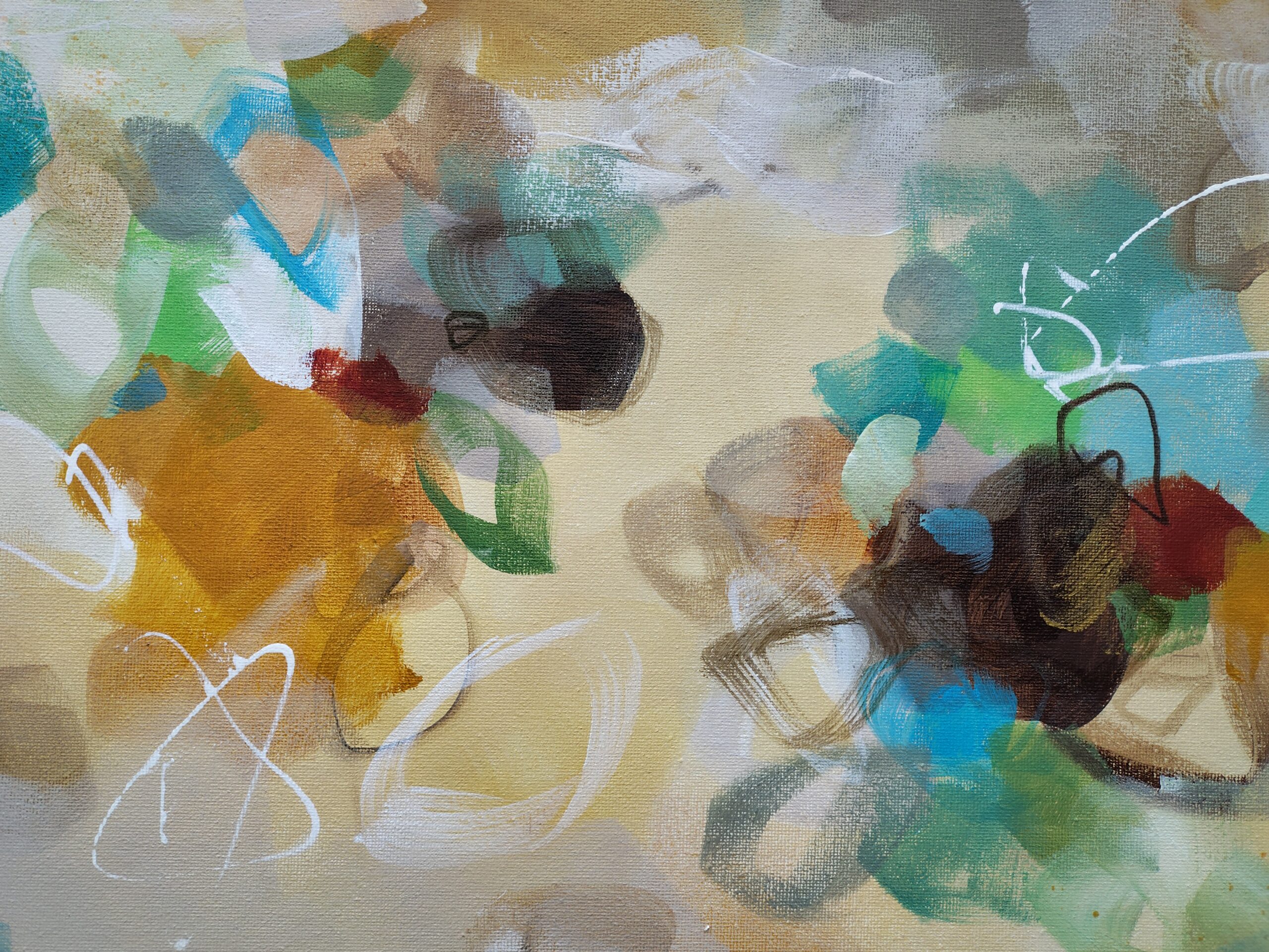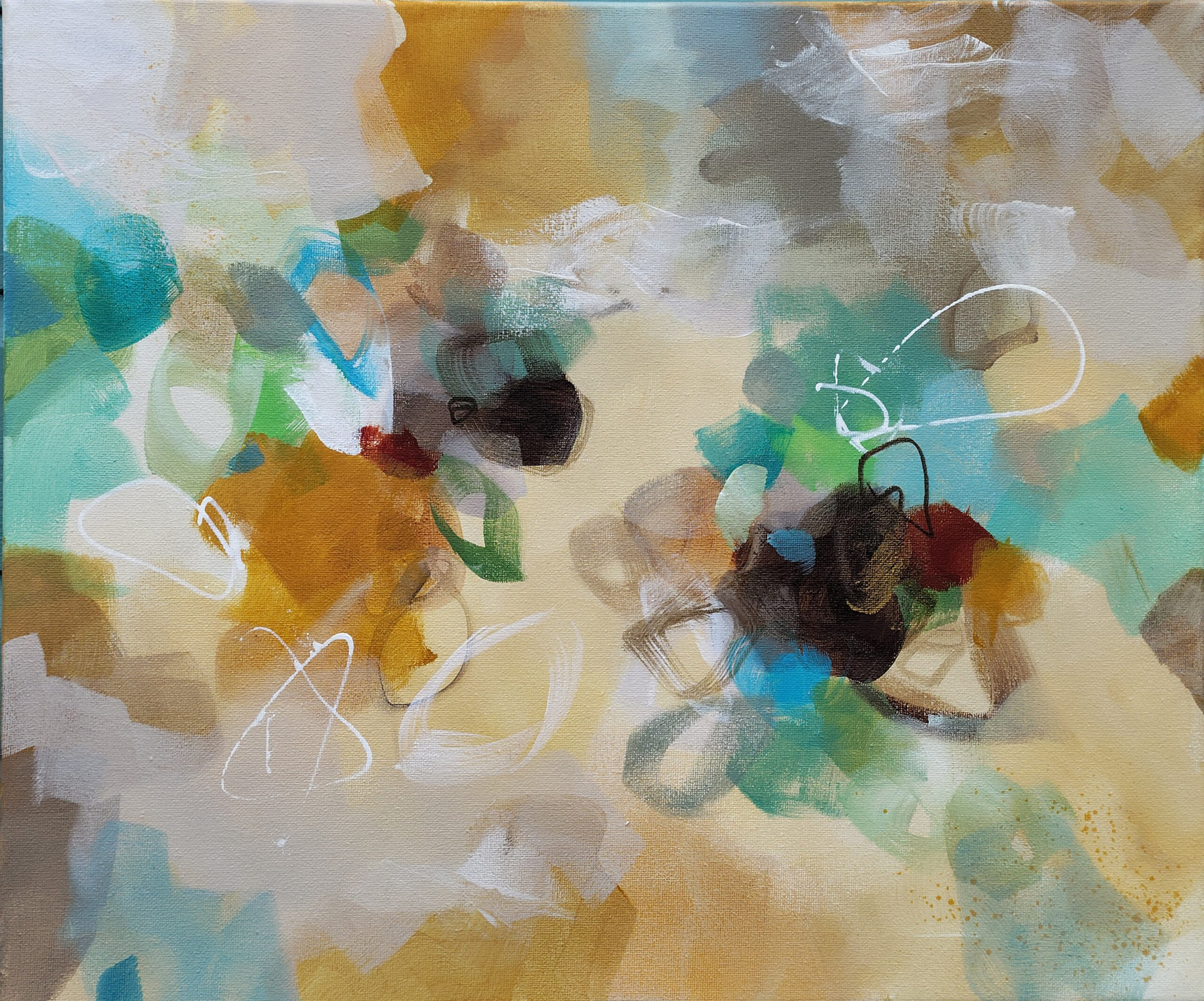 “Golden Nectar II” is an original abstract acrylic painting that glows with warmth, movement and the rich colours of nature in full bloom. Layers of turquoise, ochre, terracotta, rust, sienna, blue, green, cream and white come together in a vibrant, expressive composition that brings life and energy to any room.