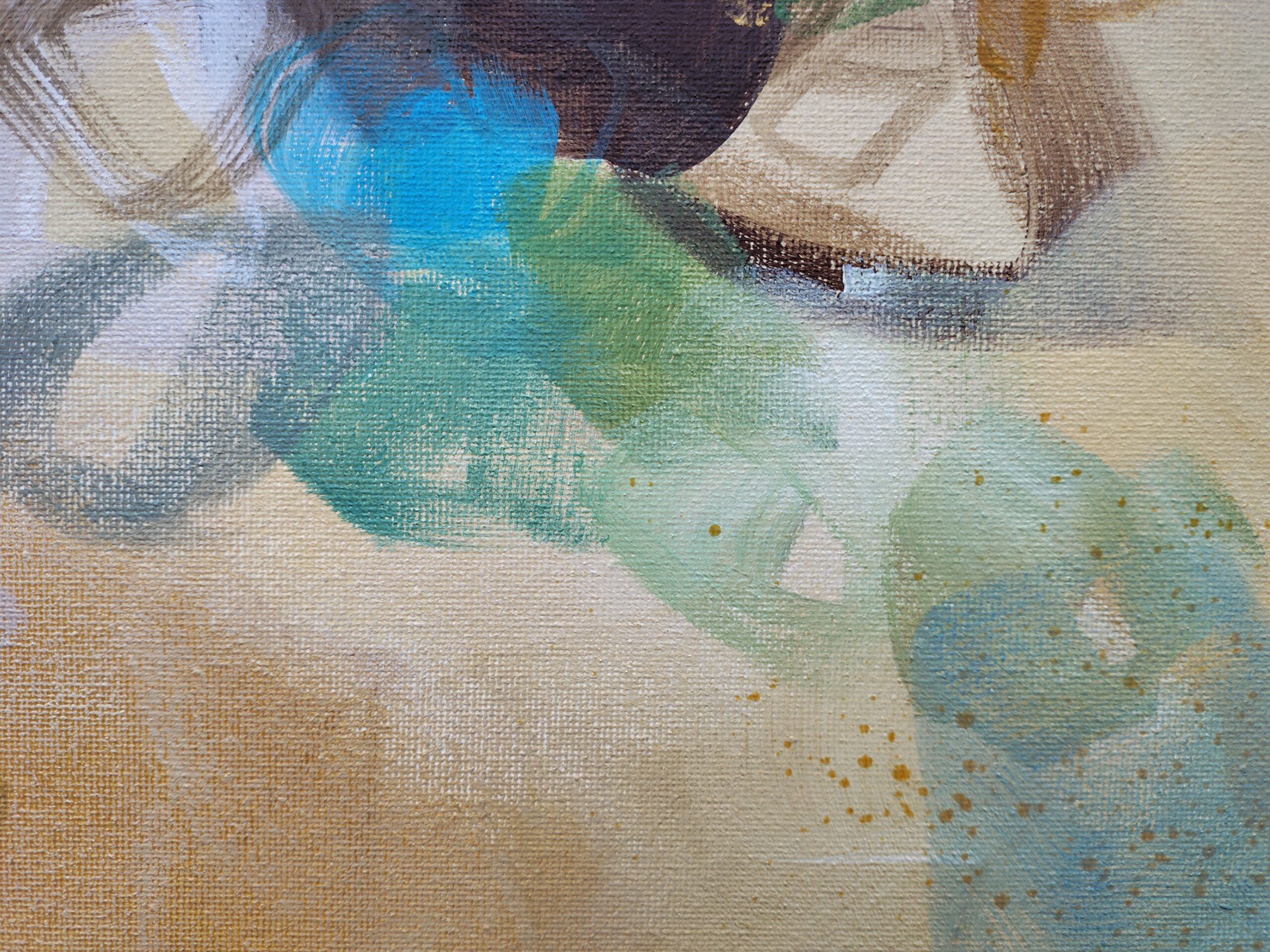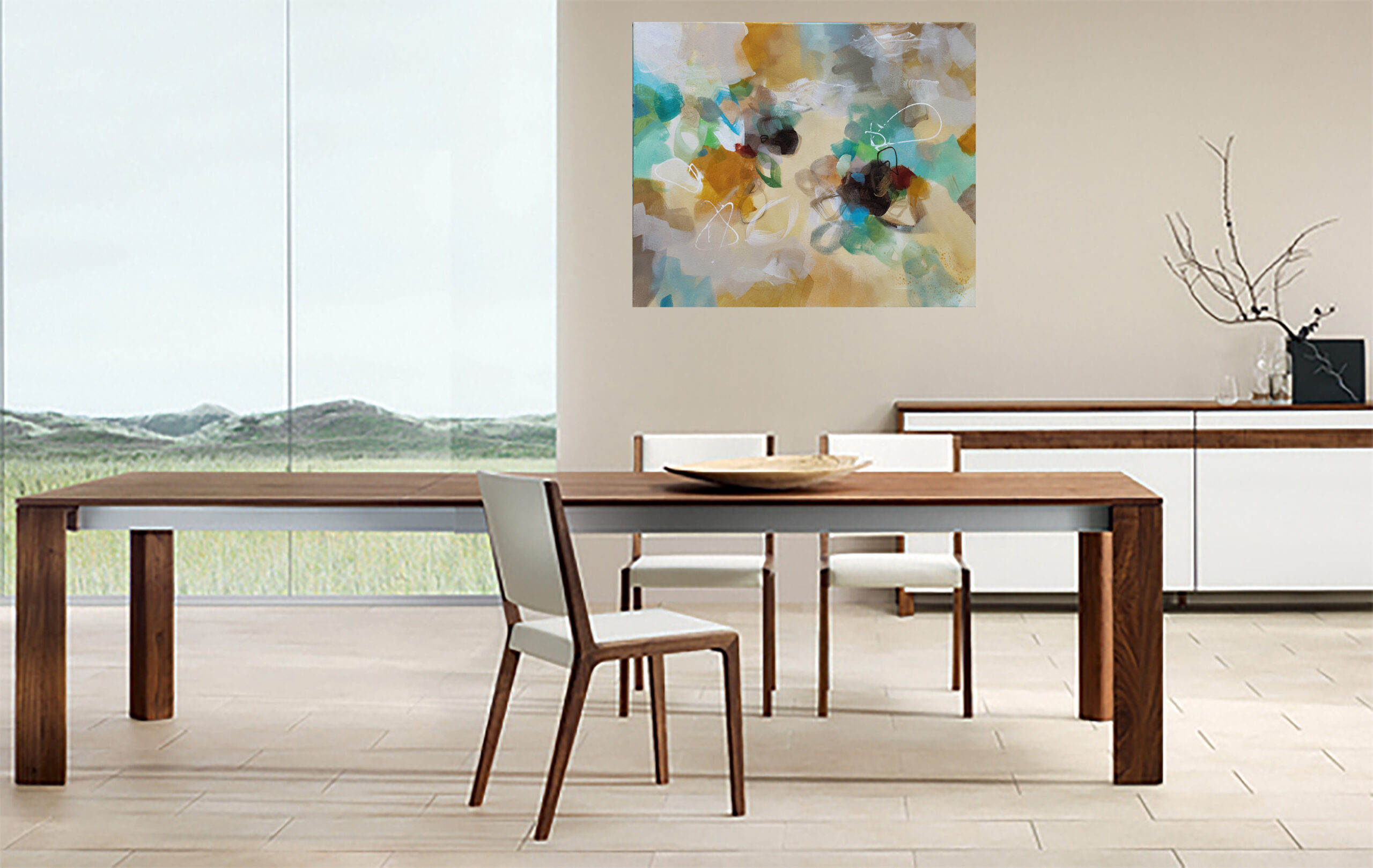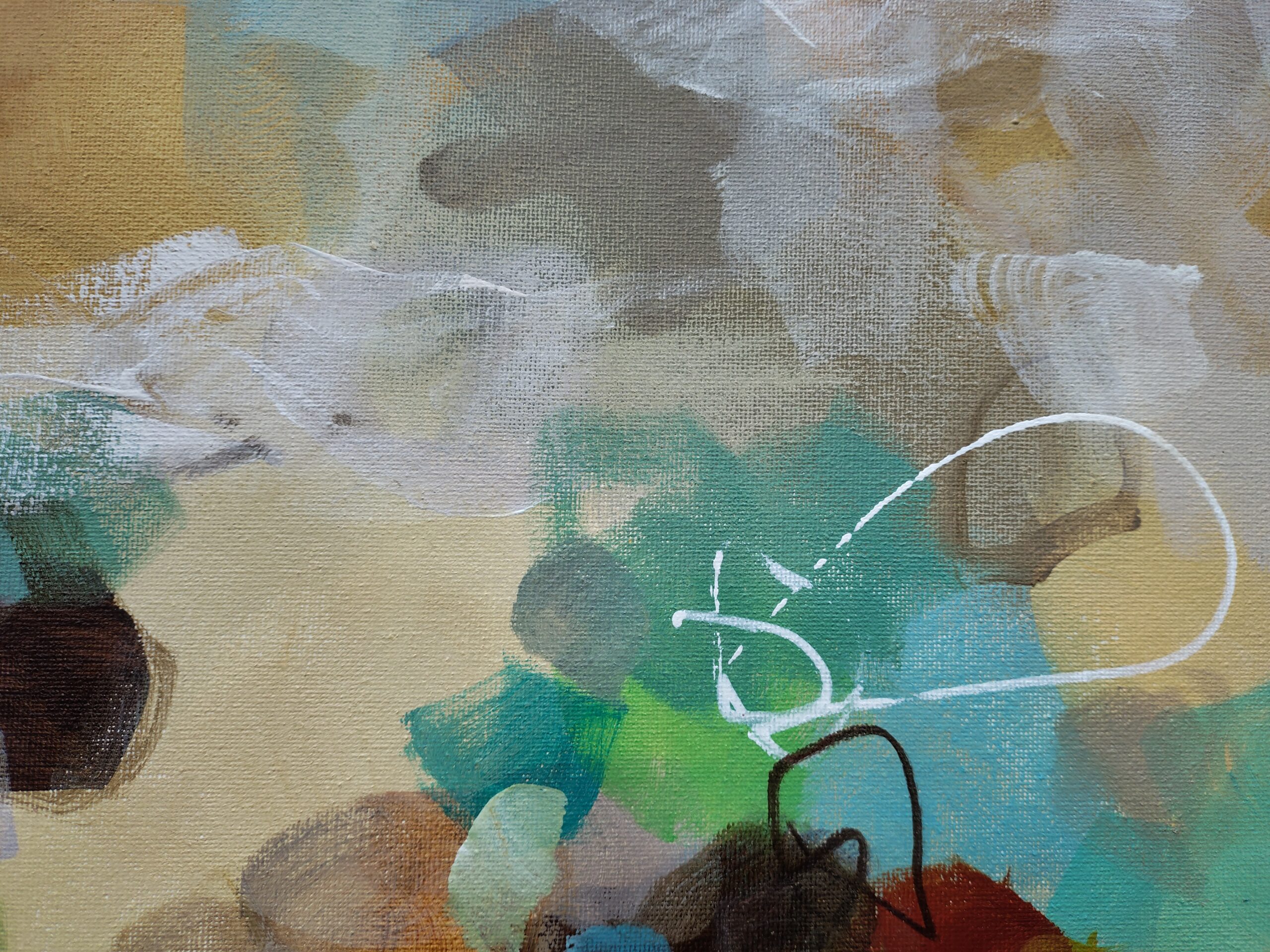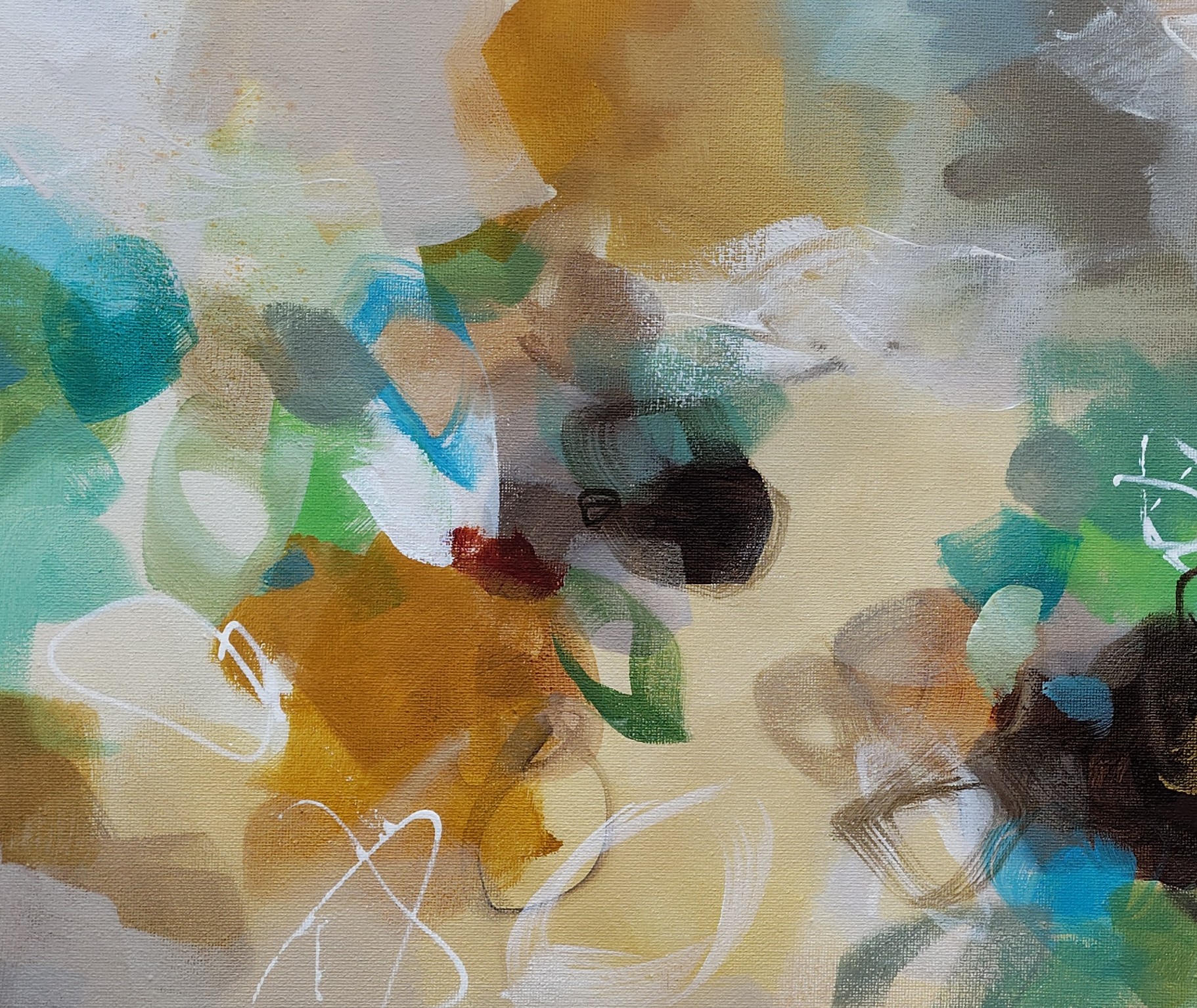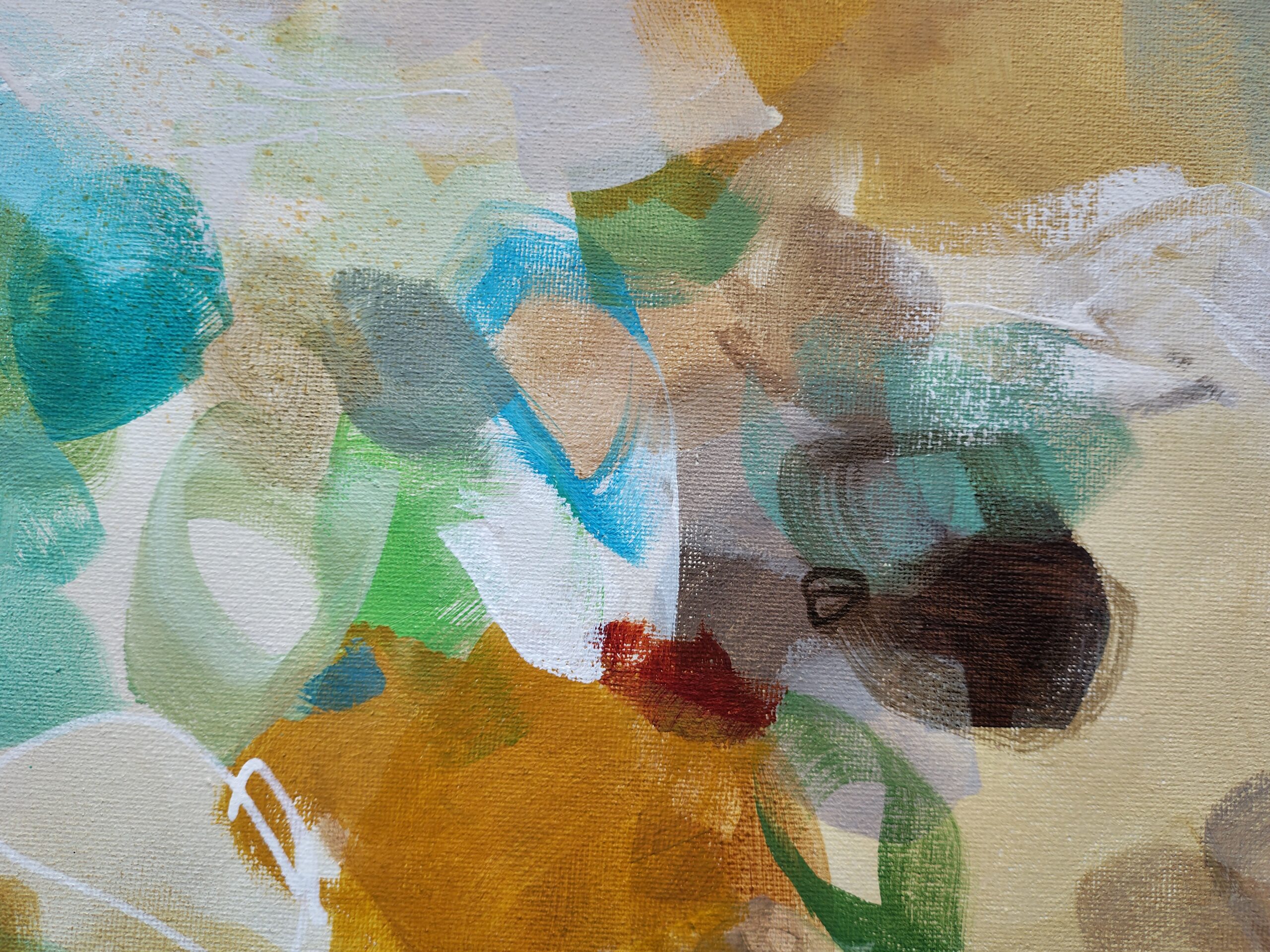 “Golden Nectar II” is an original abstract acrylic painting that glows with warmth, movement and the rich colours of nature in full bloom. Layers of turquoise, ochre, terracotta, rust, sienna, blue, green, cream and white come together in a vibrant, expressive composition that brings life and energy to any room.