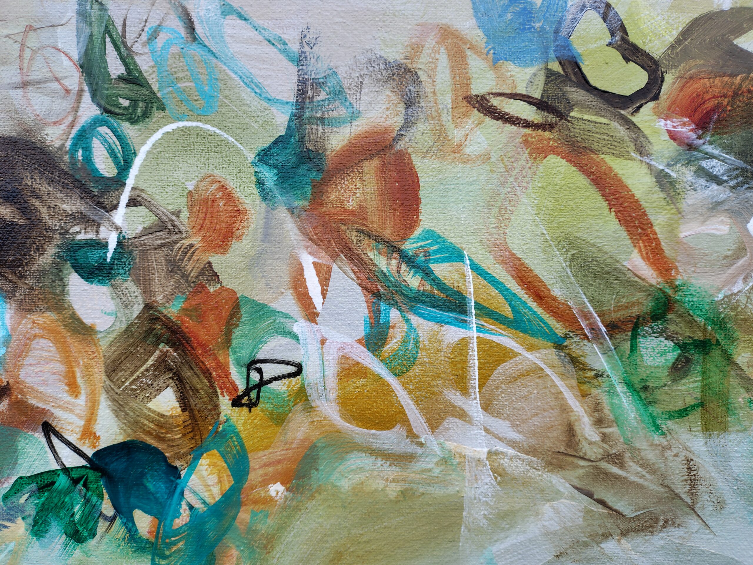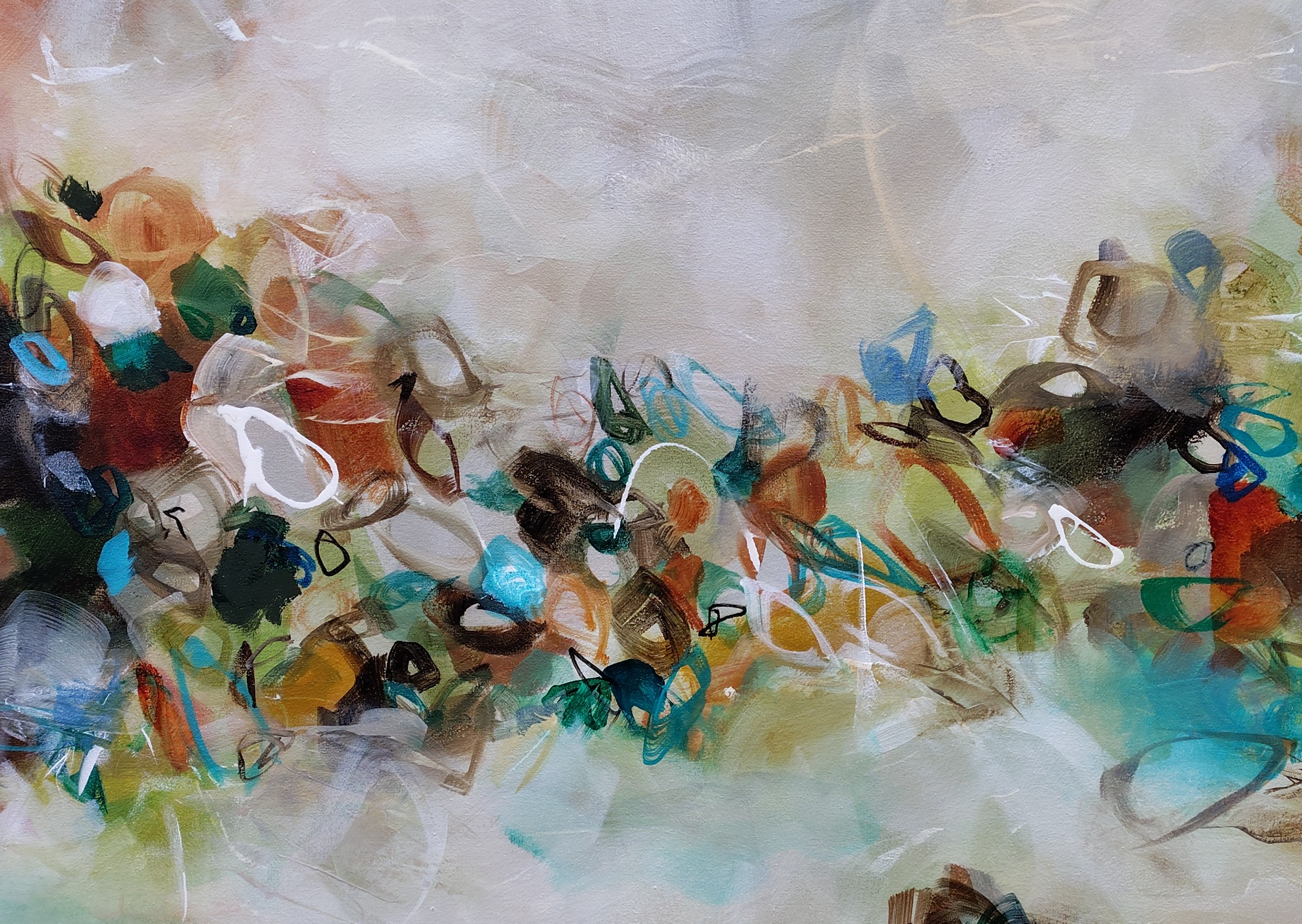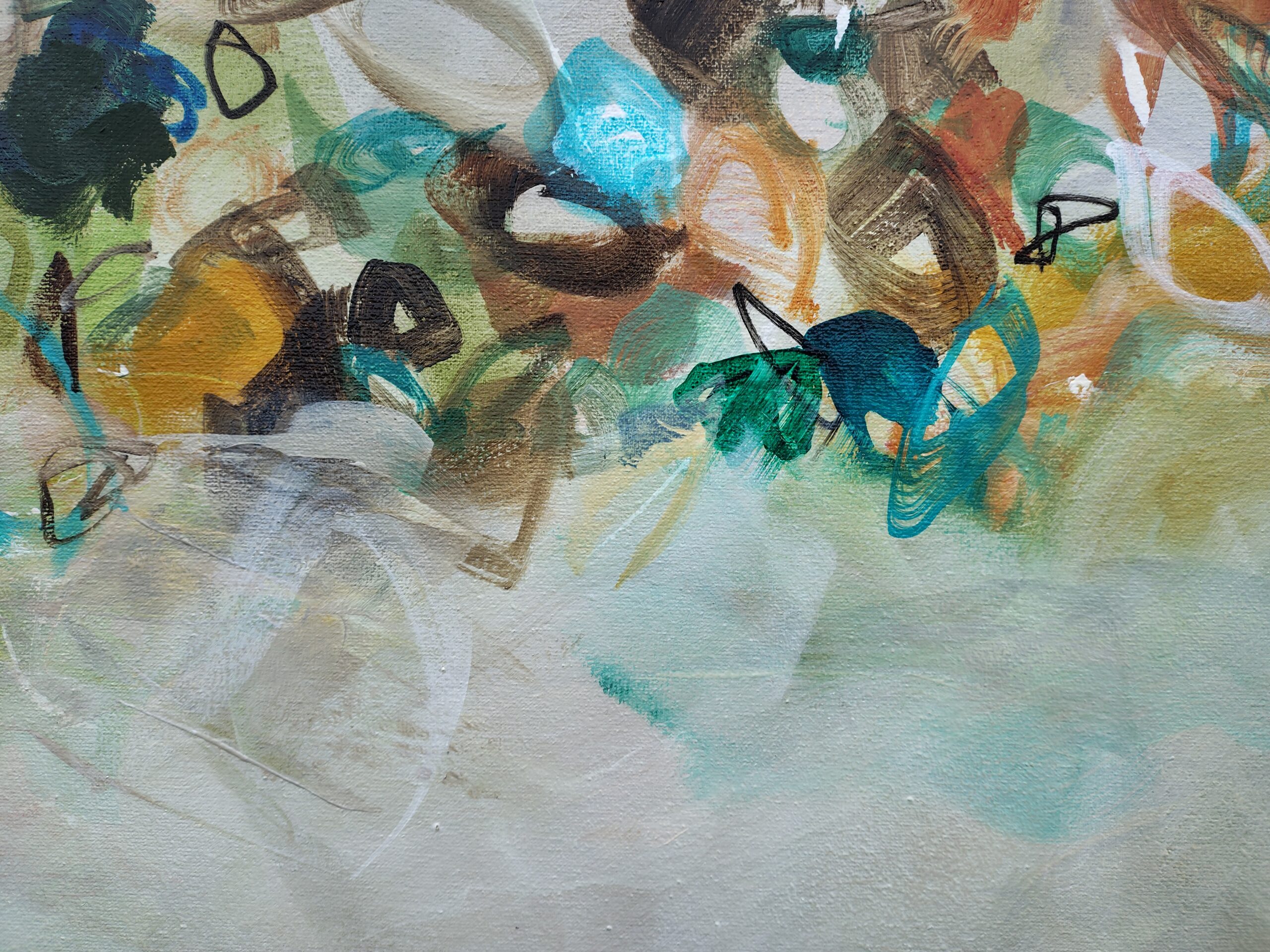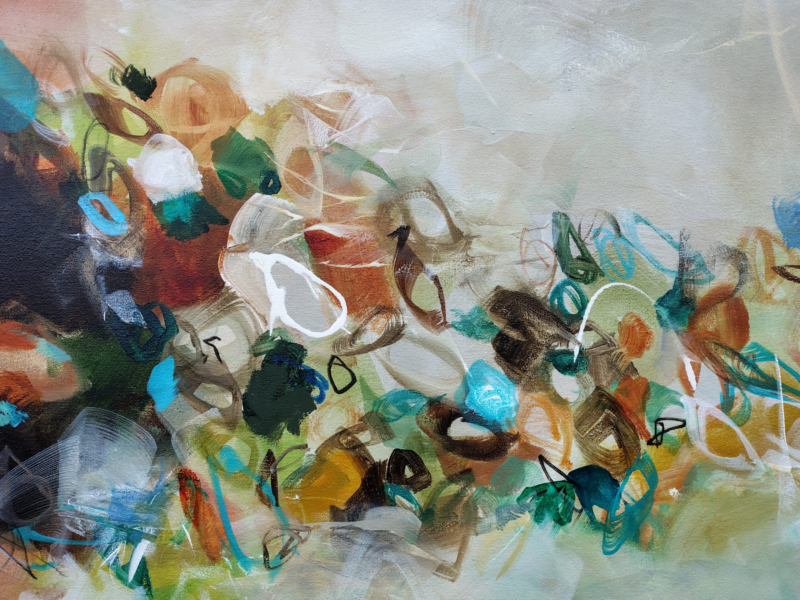 “Winds of Change” is a captivating, large abstract painting that infuses energy and colour into any room. Warm earth tones of turquoise, ochre, terracotta, brown rust, sienna, bllue. green, cream and white combine to create a vibrant composition with a sense of movement.
